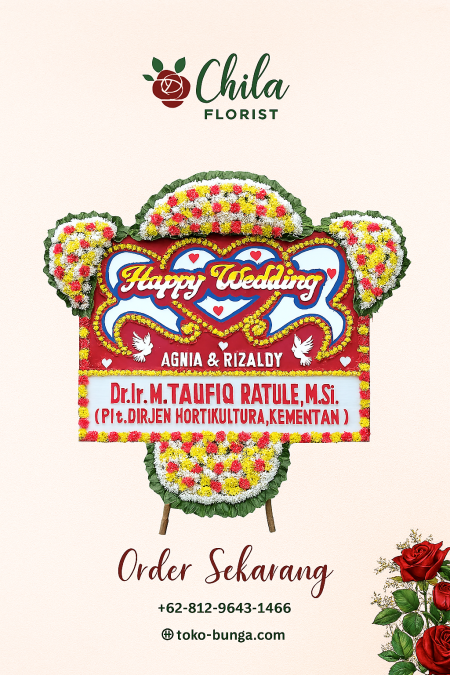 Rayakan momen bahagia dengan papan bunga wedding bertema modern atau klasik. Cocok untuk ucapan selamat kepada mempelai di gedung resepsi, ballroom, atau halaman rumah.